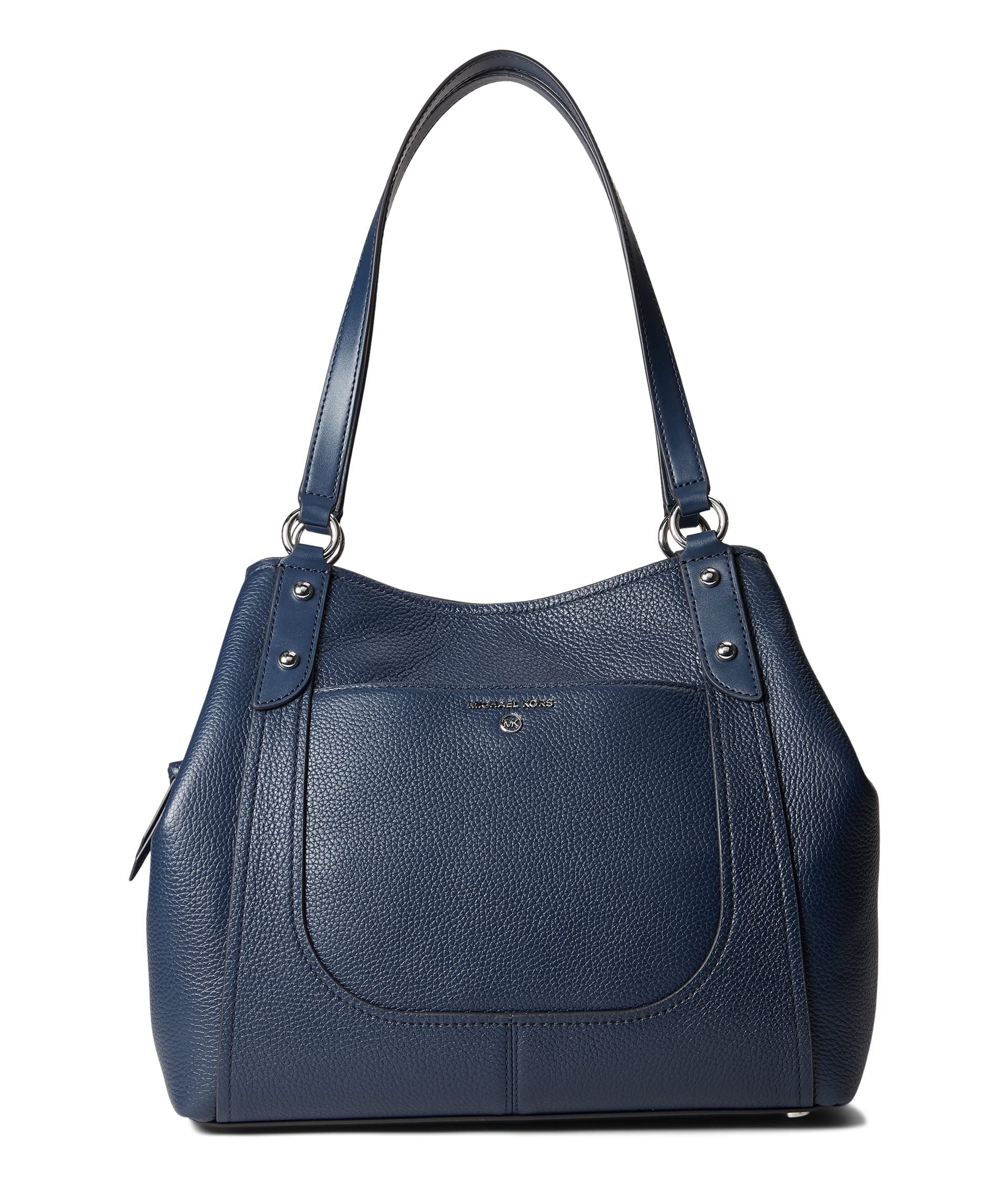 Tote bag Pebbled leather 100% leather from tanneries meeting the highest standards of environmental performance Silver-tone hardware 13.5”W X 11.5”H X 5.25”D Handle drop: 9” Exterior details: front slip pocket Interior details: back zip pocket, 2 back slip pockets, 6 front slip pockets Lining: 100% polyester Snap/zip fastening Imported